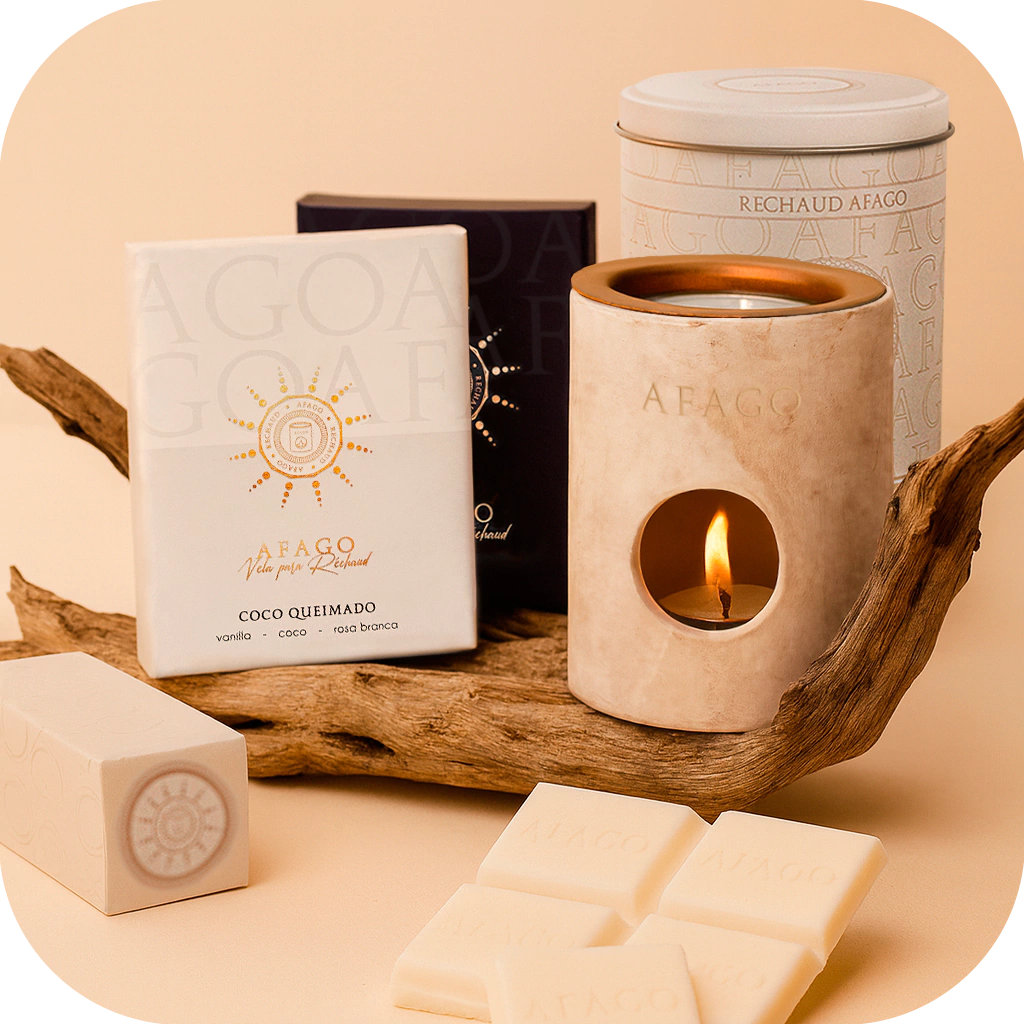 Descrição: O kit é composto por 1 Réchaud na lata de Metal, 2 barras de vela Afago e 6 mini velas.